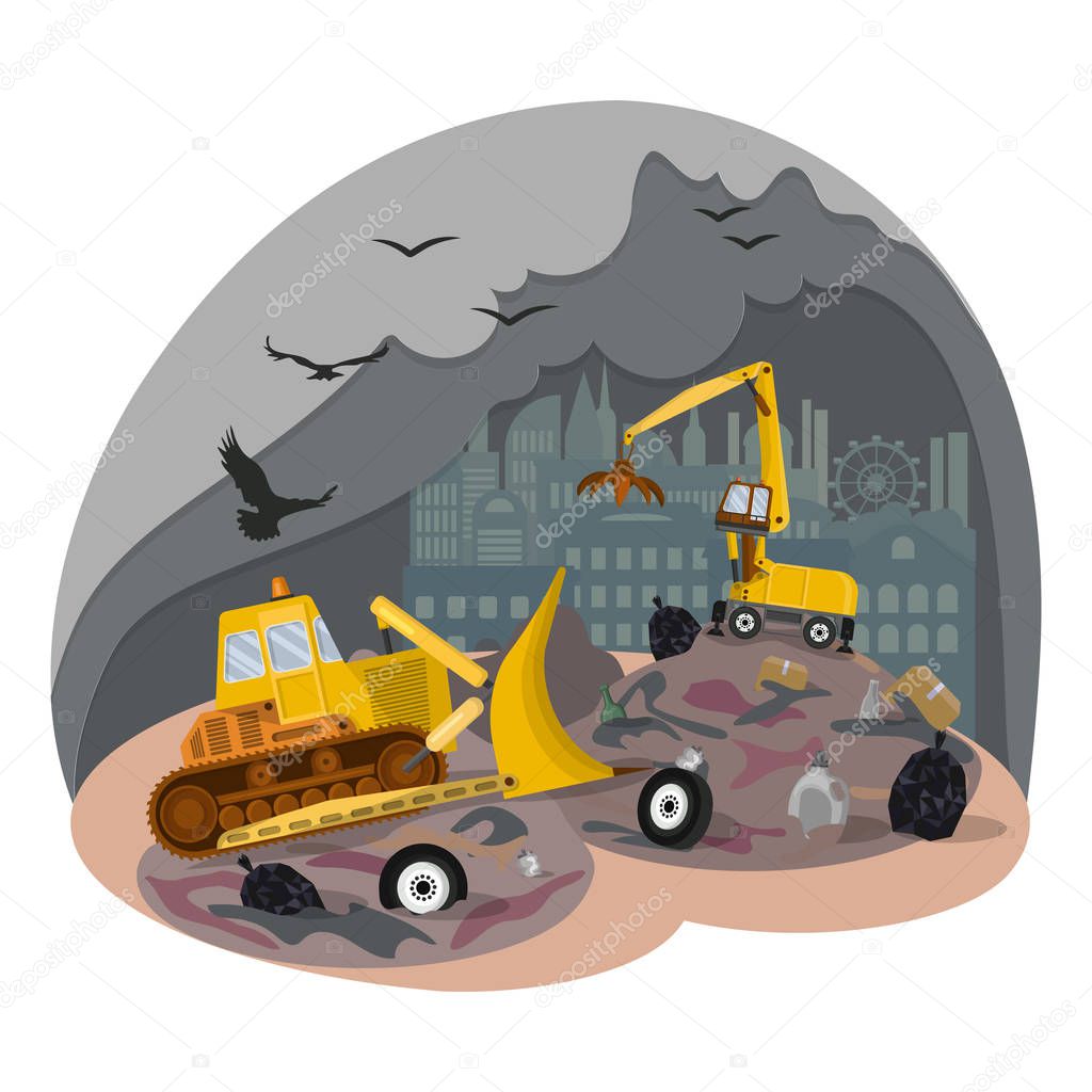 City Dump Landfill Environmental Pollution Problem Of Waste Disposal Compactor For Garbage At Work Special Equipment Concept Of Site Applications Flat Cartoon Vector Illustration Premium Vector In Adobe Illustrator Ai
