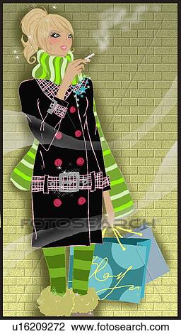 Donna Fare Intervallo Da Shopping Con Lei Sigaretta Disegno U Fotosearch