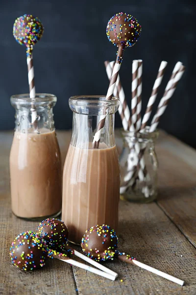 Botellas De Leche De Chocolate Con Pajitas Y Pasteles Pops Foto De Stock C Sandralise