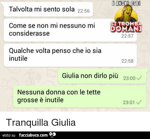 Mi sento insignificante, davvero tanto, hanno sempre di meglio e io sono quella scansata da tutti, mi viene da piangere Non voglio rapporti solo per divertirsi, ma anche per cose profonde, un'amicizia stile serie tv o anime o film. Mi sento sola 246 likes ♥ Facebook Uploads. Una delle frasi che ho sentito dire di più, e che ho detto di più, è.