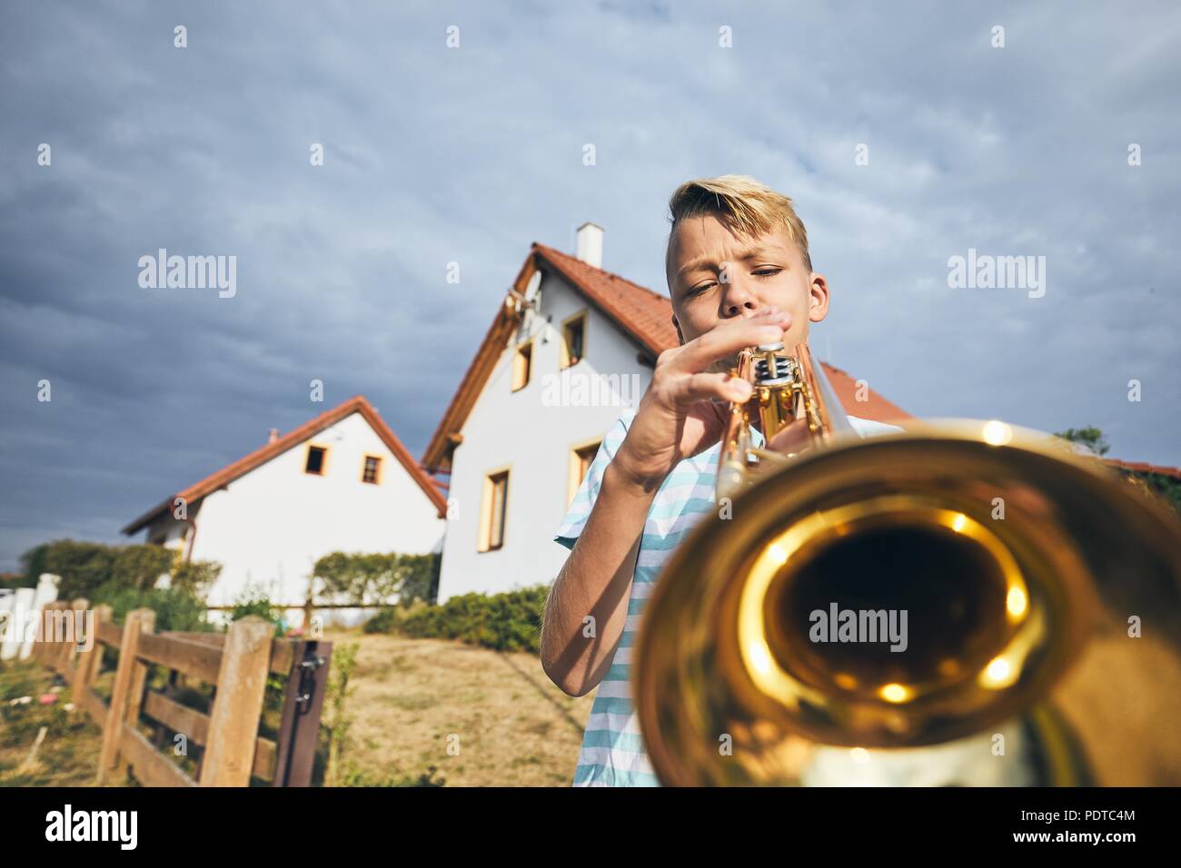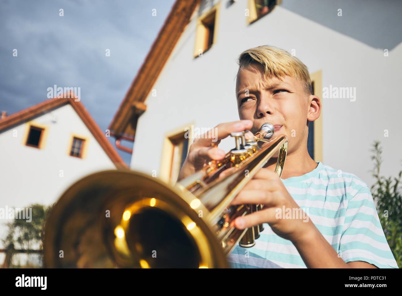 Little Boy A Suonare La Tromba Davanti Alla Casa Foto Stock Alamy