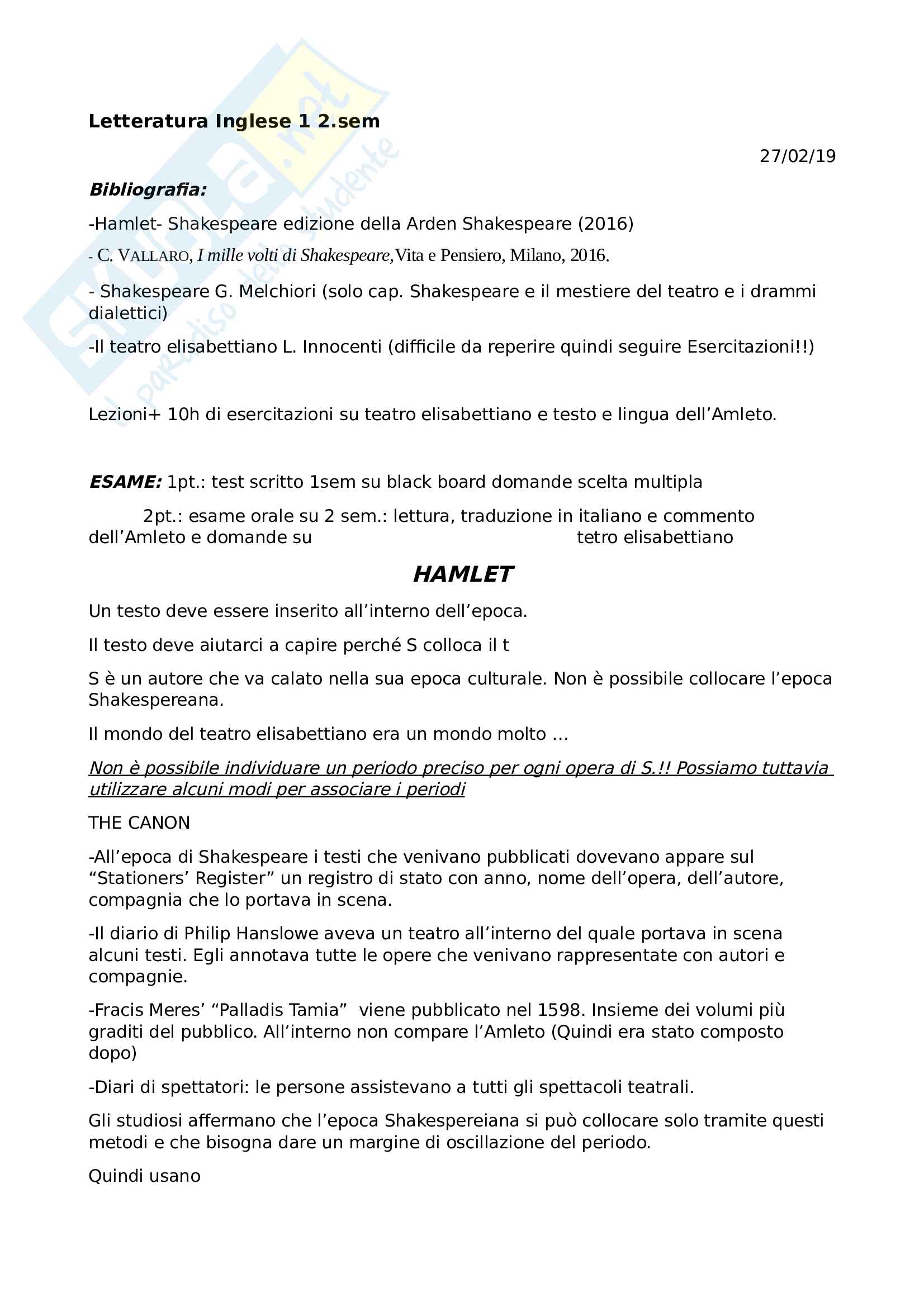 Letteratura Inglese I Semestre Docsity