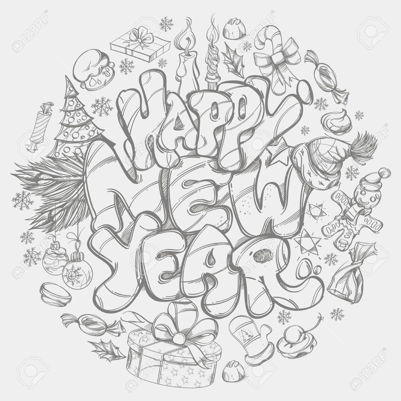 Happy New Year Hand Drawn Outline Illustration With Text And Royalty Free Cliparts Vectors And Stock Illustration Image 9162