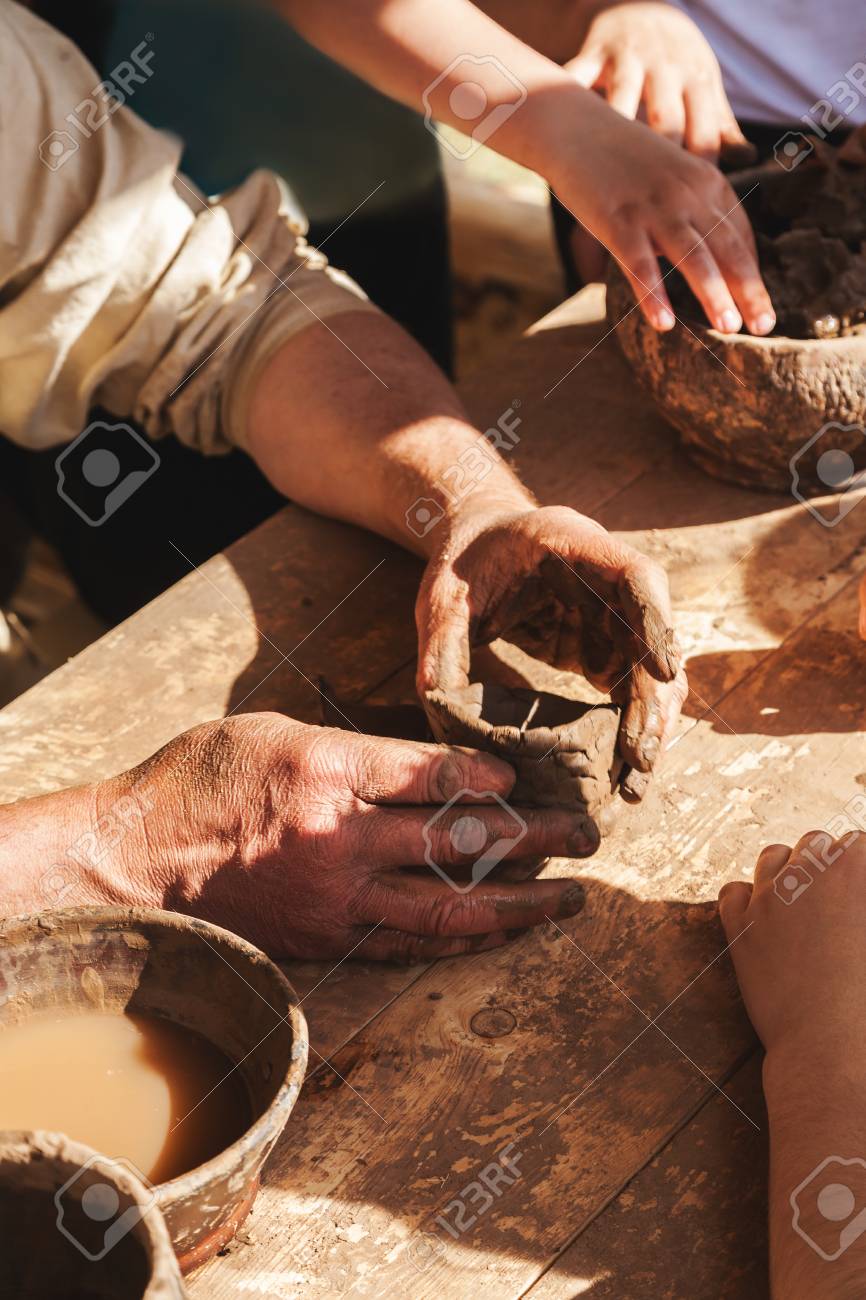Immagini Stock Vecchie Mani Giovani Che Lavorano Con Argilla Cruda Verticale Image