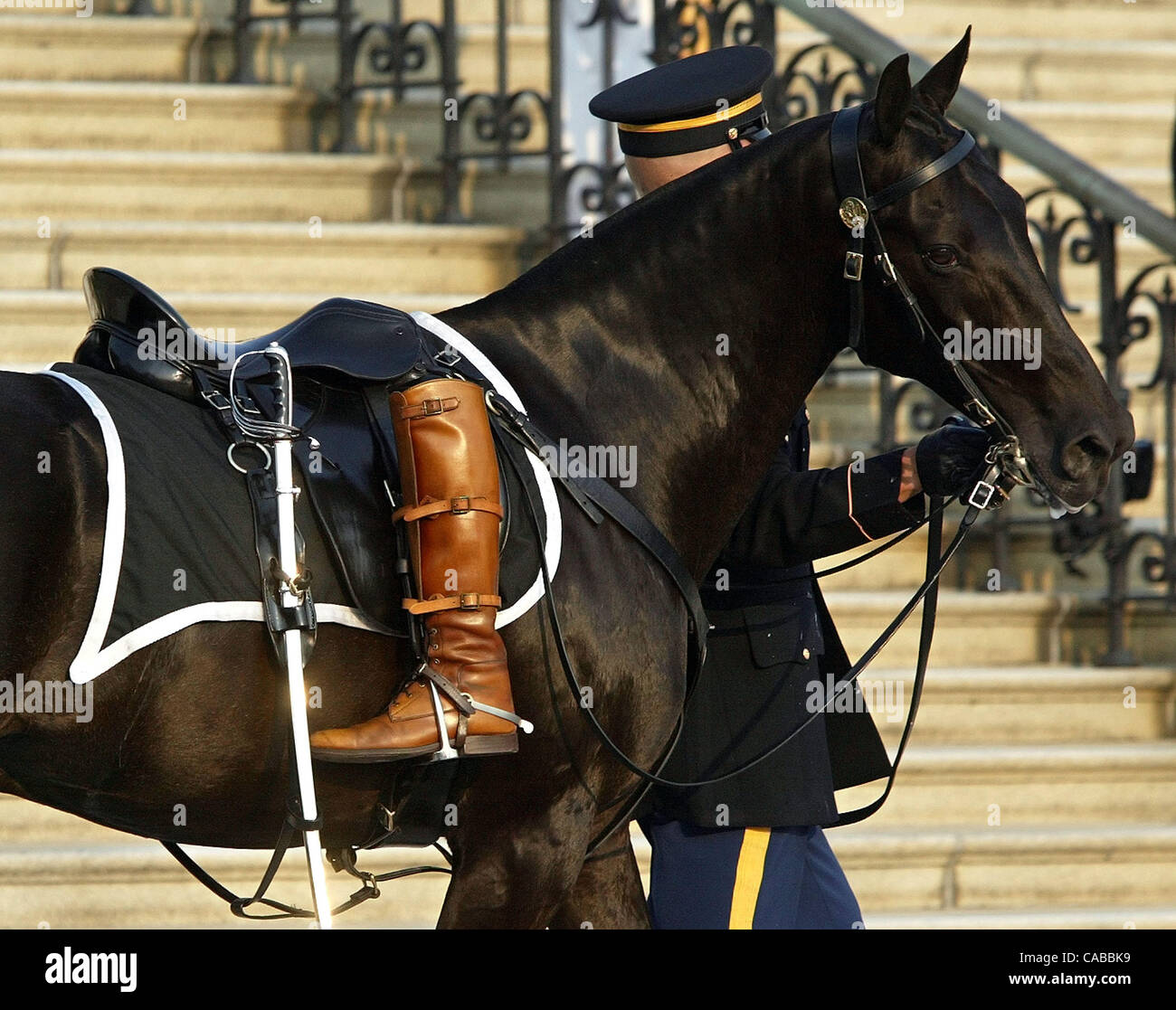 Washington D C Un Simbolico Riderless Horse Con Un Paio Di Stivali Invertiti Sulla Sella Segue Il A Cavallo Il Cassettone Portando L Ex Presidente Ronald Reagan Per Le Fasi Del