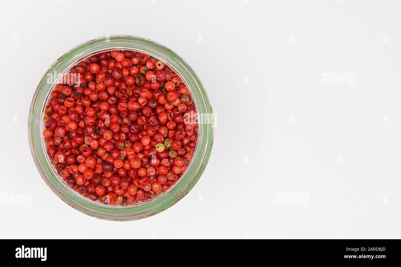 Vista Dall Alto Sull Apertura Di Un Vasetto Di Vetro Isolato Con Grani Di Pepe Rosso E Fondo Bianco Vuoto Foto Stock Alamy