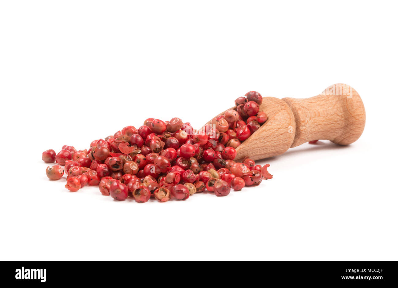 Grani Di Pepe Rosso Isolato Su Sfondo Bianco Grani Di Pepe Rosa In Una Paletta Di Legno Foto Stock Alamy