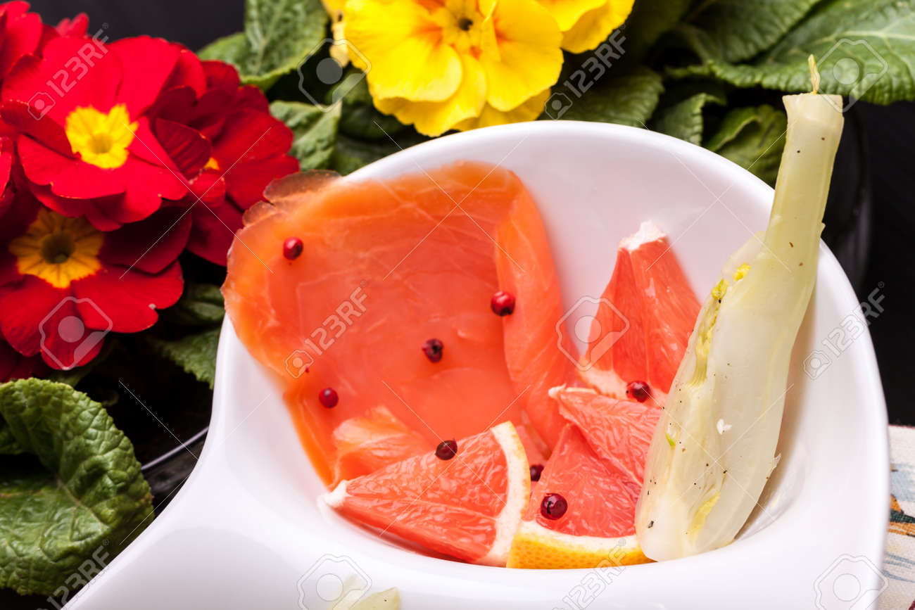Immagini Stock Salmone Affumicato Decorato Con Grani Di Pepe Rosso E Pezzi Di Pompelmo Rosa Image 1495