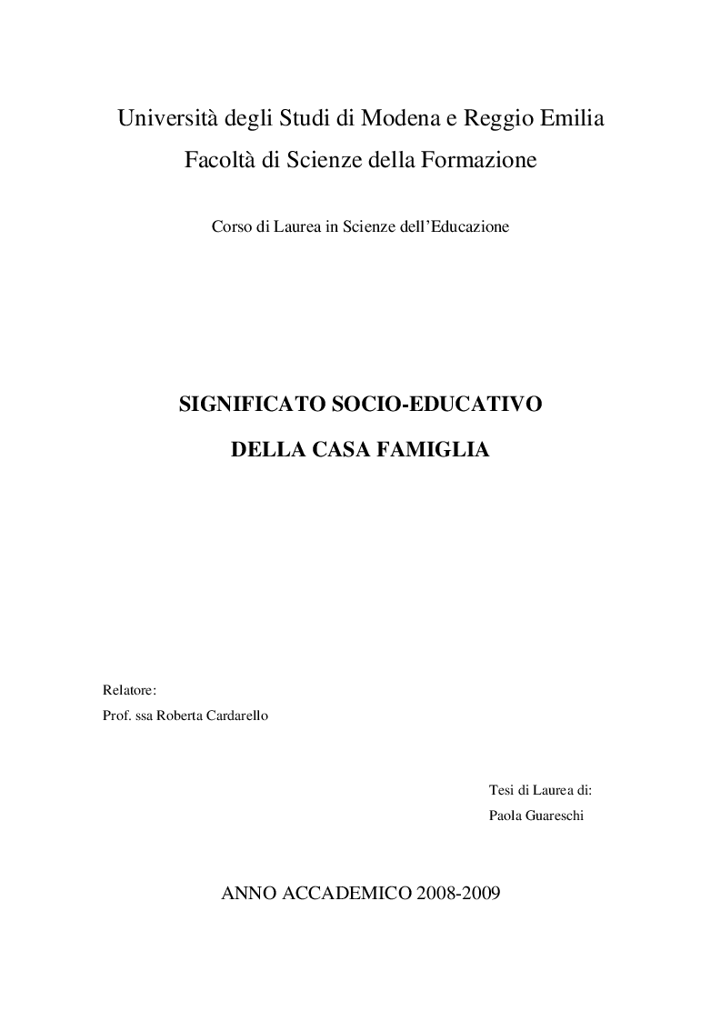 Universita Degli Studi Di Modena E Reggio Emilia Facolta Di Scienze Della Formazione Corso Di Laurea In Scienze Dell Educazione Significato Socio Educativo Della Casa Famiglia Relatore Tesionline