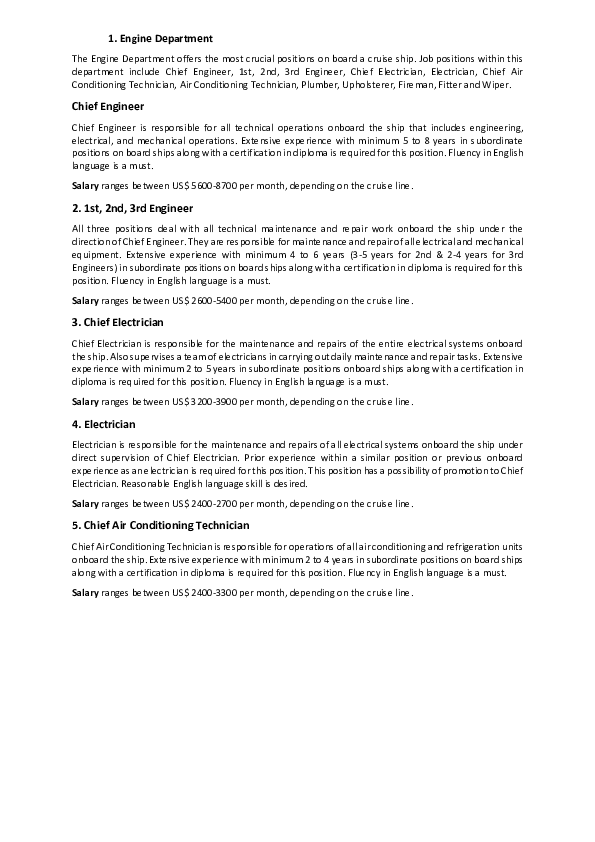 Chief Engineer* 4,0007,000 5,0007,500 6,0008,000 7,,000 8,,000 Chief Engineer Rotation** 6,0007,500 6,5008,000 7,,000 9,000 2nd Engineer* 4,5006,000 5,0006,500 6,0007,000 6,000 2nd Engineer Rotation** 5,000 5,500 ETO 6,000 Purser 7,000 8,000. Let us assume you want to know the salary of a Chief Engineer who is Indian, experienced for around 3 years (I will clarify later why I assumed 3 years) and is employed with a standard company with good wages The wages will vary depending on the. Chief Engineers in America make an average salary of $84,931 per year or $40 per hour There is a huge gap between the top 10 percent earners and the bottom 10 percent earners about 67,000 The top 10 percent earn over $124,000, while the bottom 10 percent make less than $57,000 annually.