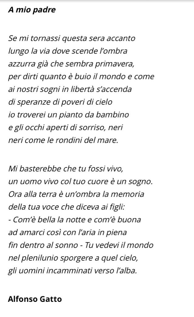 ALFONSO GATTO " A MIO PADRE" Se mi tornassi questa sera accanto lungo la via dove scende l'ombra azzurra già che sembra primavera, per dirti quanto è buio il mondo e come ai nostri sogni. A mio padre Padre del poeta Alfonso Gatto Se mi tornassi questa sera accanto lungo la via dove scende l'ombraazzurra già che sembra primavera,per dirti quanto è buio il mondo e comeai nostri sogni libertà s'accendadi speranze di poveri di cielo,io troverei un pianto da bambinoe gli occhi aperti di sorriso, nerineri come le rondini del mare. A Gatto, “A mio padre” alfonso gatto A mio padre Frasi Citazioni Amore Notte Sonno Amare Vita Vivere Salerno Fotografia Leggere Libri Letteratura Poesia 47 notes Jan 4th, 19.