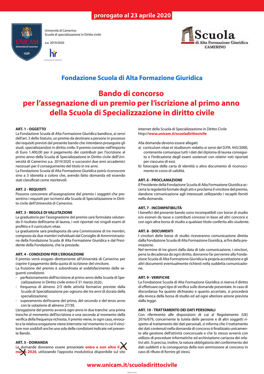 Prorogata Al 23 Aprile La Partecipazione Al Bando Per L Assegnazione Di Un Premio Per L Iscrizione Al Primo Anno Della Scuola Di Specializzazione In Diritto Civile Universita Di Camerino
