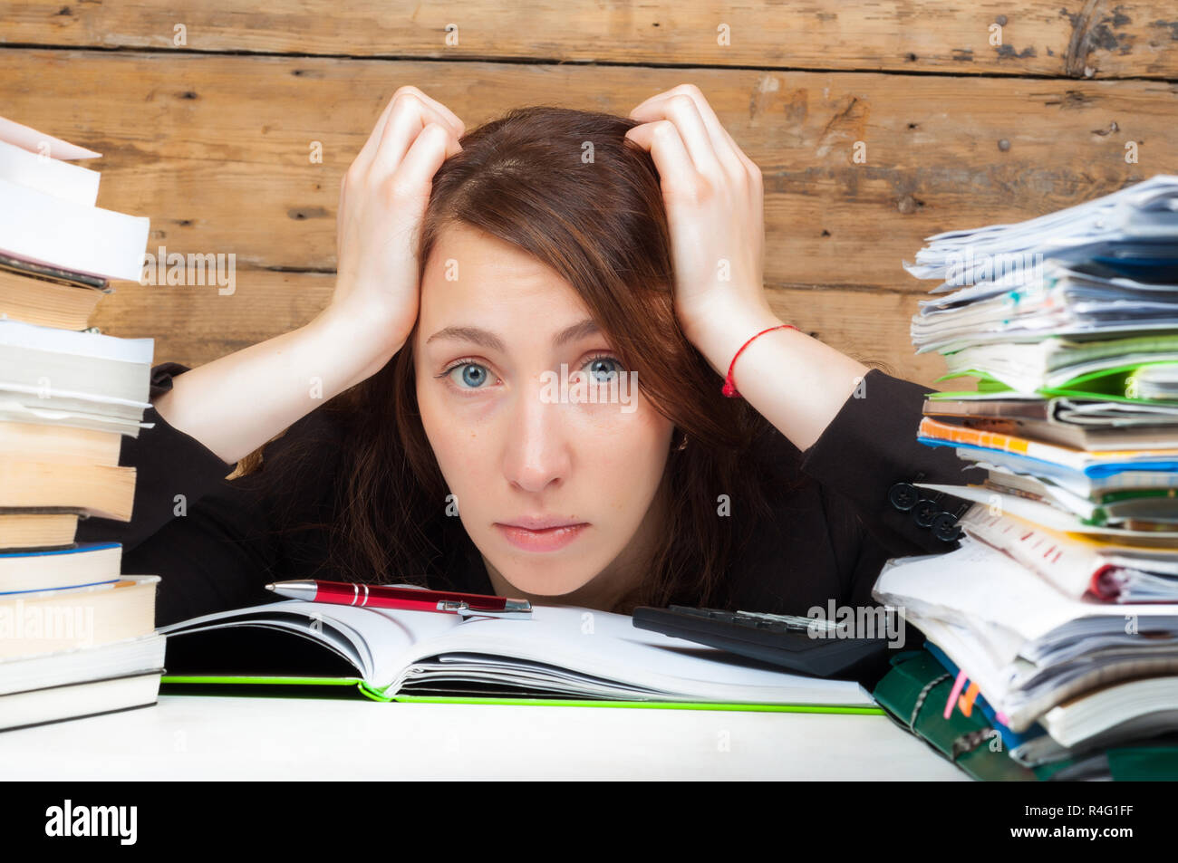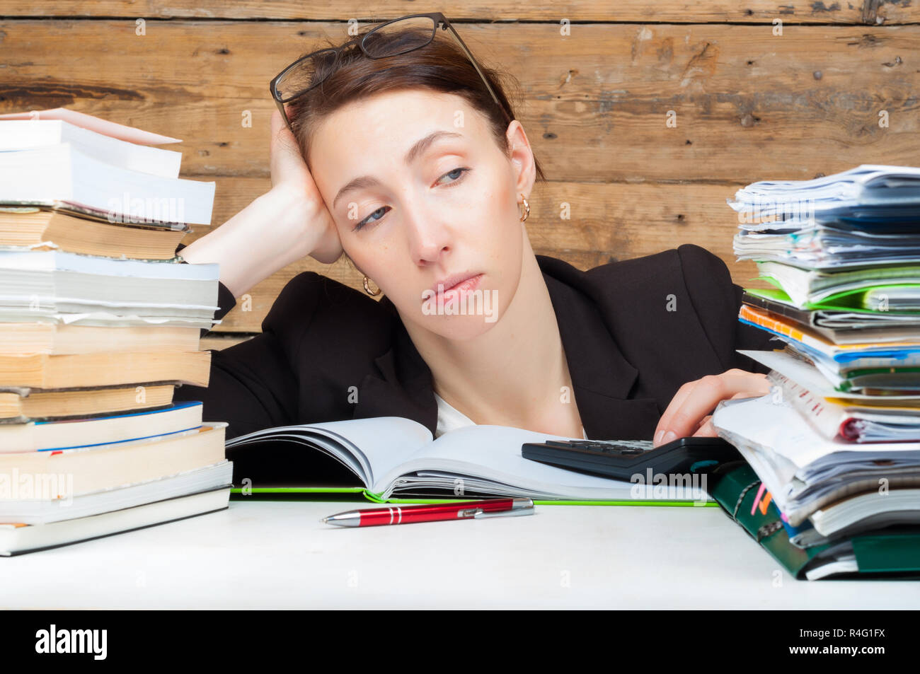 Donna Stanchi Di Lavorare E Studiare Accanto Alla Pila Di Documenti E Libri Lavoro E Concetto Di Studio Foto Stock Alamy