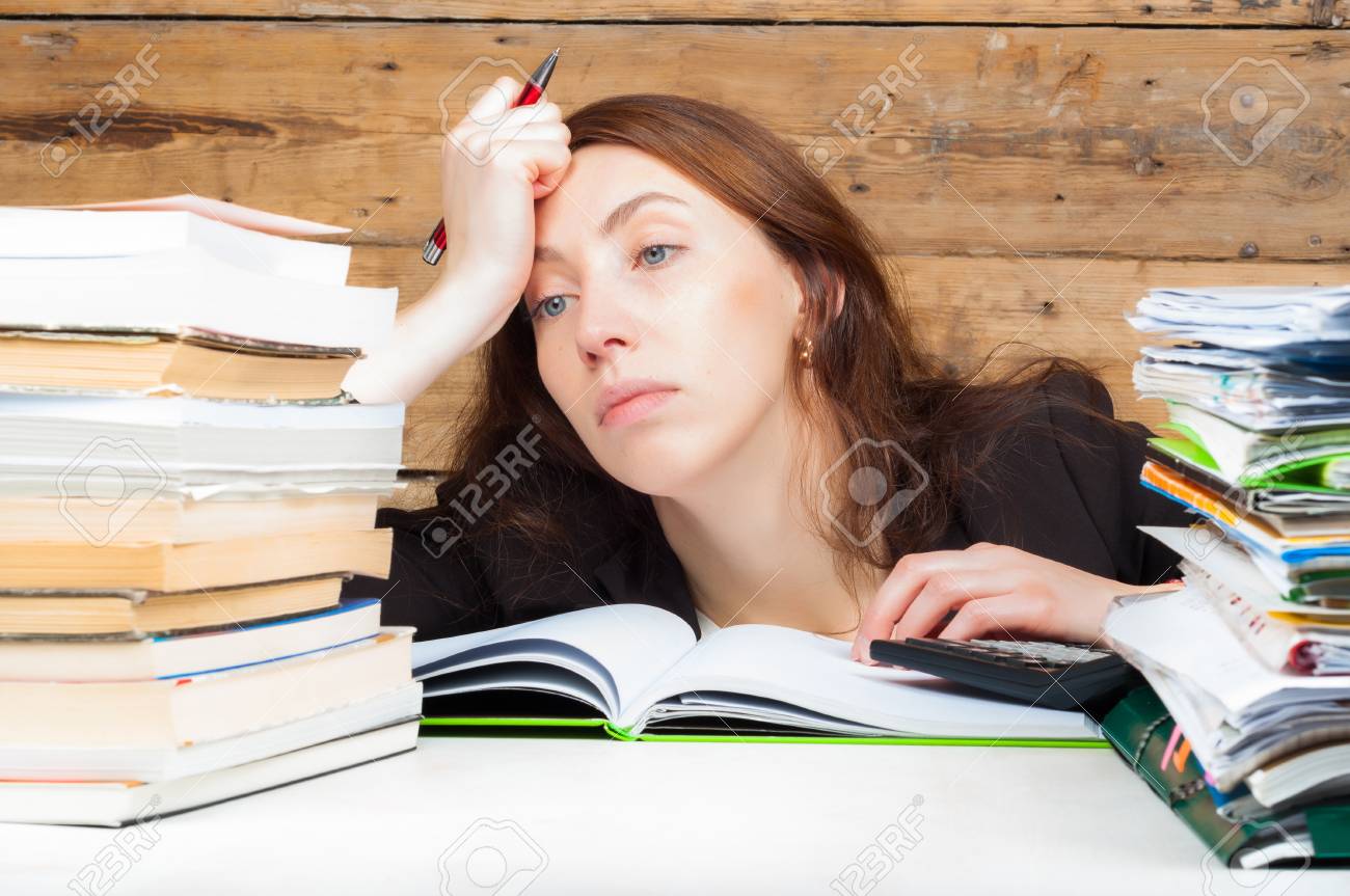 Immagini Stock La Donna Si E Stancata Di Lavorare E Studiare Accanto Alla Pila Di Carte E Libri Lavorare E Studiare Concetto Image