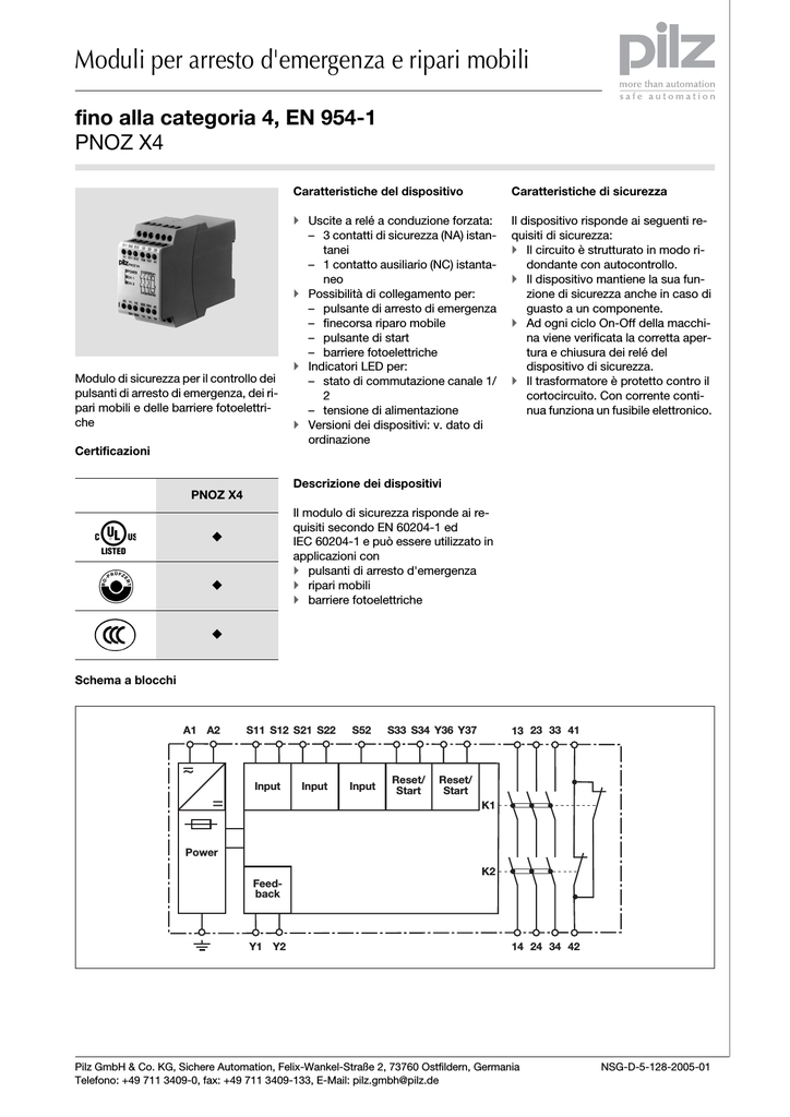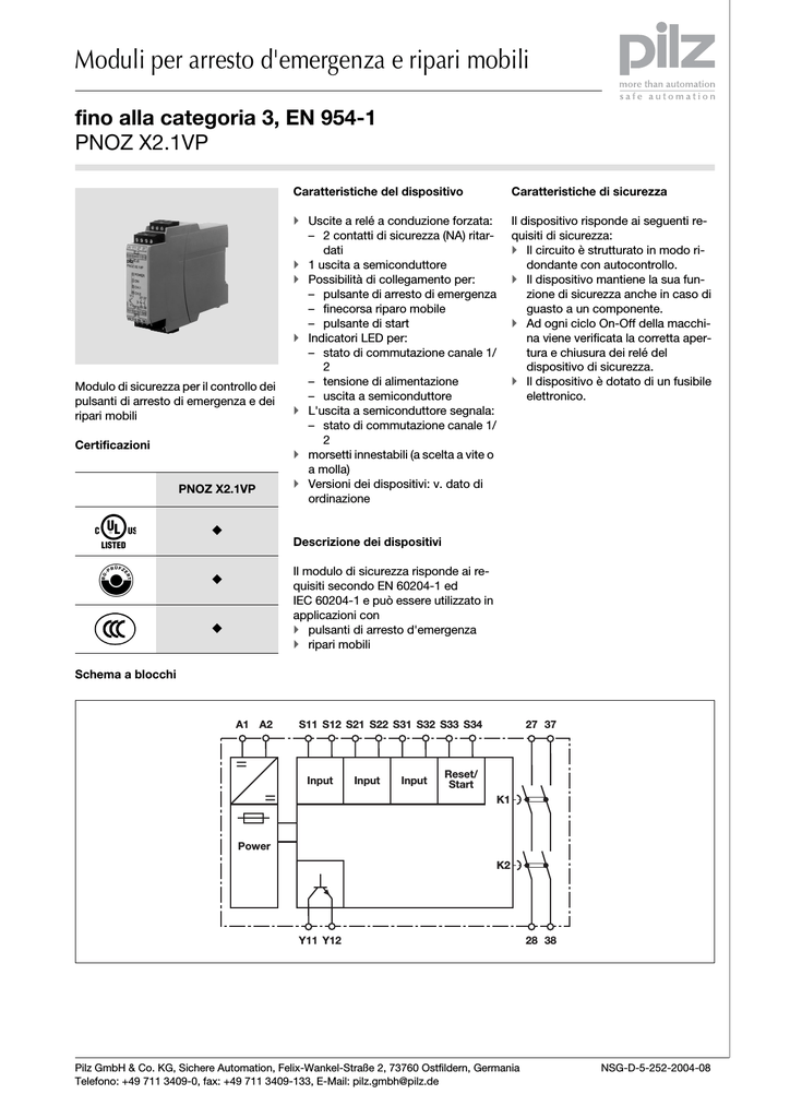 La centralina NC95 è stata realizzata per il controllo di tappeti e bordi di sicurezza sensibili alla pressione in accordo con la EN ISO , EN ISO , EN A109, EN ISO Il funzionamento di questo modulo si basa sull'utilizzo di relé di sicurezza a contatti guidati !. Modulo di sicurezza Pizzato Elettrica serie CS L’interruttore è dotato di un ampio imbocco di centraggio per il perno dell’azionatore Tale soluzione rende più facile l’allineamento tra l’azionatore e il foro presente nella testa durante la fase di montaggio Inoltre questa soluzione riduce drasticamente le probabilità di colli. Il modulo di sicurezza può controllare circuiti di arresto d’emergenza, circuiti di controllo per ripari mobili o sensori magnetici di sicurezza Sostituire ai contatti degli arresti i contatti degli interruttori o dei sensori DICHIARAZIONE DI CONFORMITA’ 12 ATTESTATO DI ESAME IMQ.
