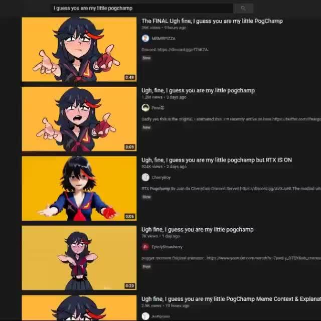 Ugh Fine, I Guess You Are My Little PogChamp, Come Here My Little PogChamp November See more 'My Little PogChamp' images on Know Your Meme!. Thought I make my own version of this sequence And since I really enjoy seeing Ryuko Matoi in any kind of transformation related artwork, I could not help it but to make more of her bimbofied version Hope you enjoy this one. Ugh fine, I guess you are my little PogChamp #killlakill #animeme #shitpost 2739.