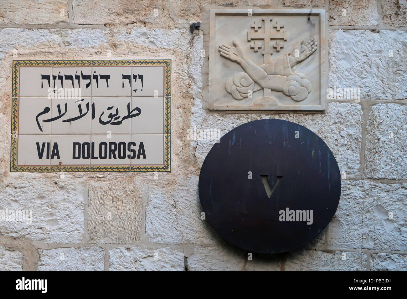Segno Su Piastrelle Ceramiche In Inglese Ebraico E Arabo Presso La Cappella Di Simone Di Cirene