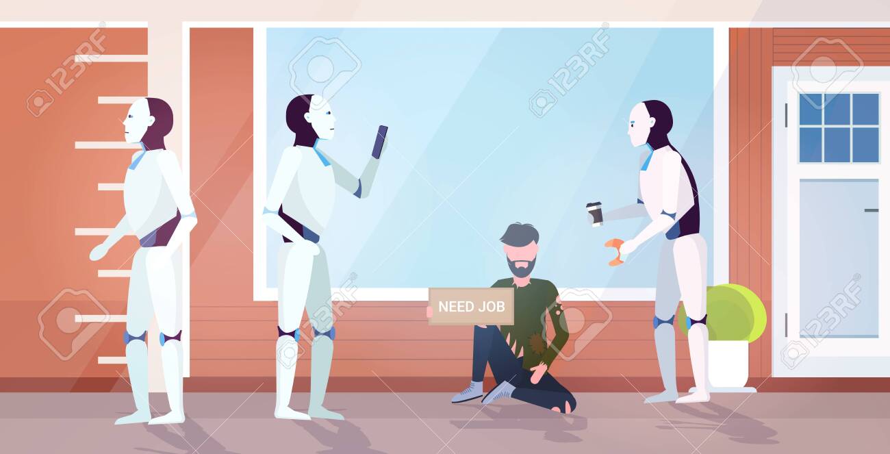 Robot Giving Food For Unemployment Poor Man With Need Job Sign Royalty Free Cliparts Vectors And Stock Illustration Image