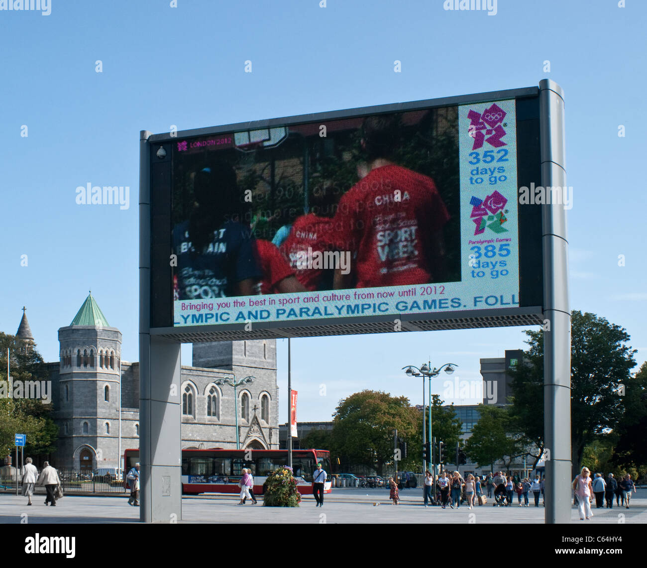 Un Colpo Lungo Di Uno Schermo Gigante In Plymouth Town Center Advertising Le Olimpiadi Foto Stock Alamy