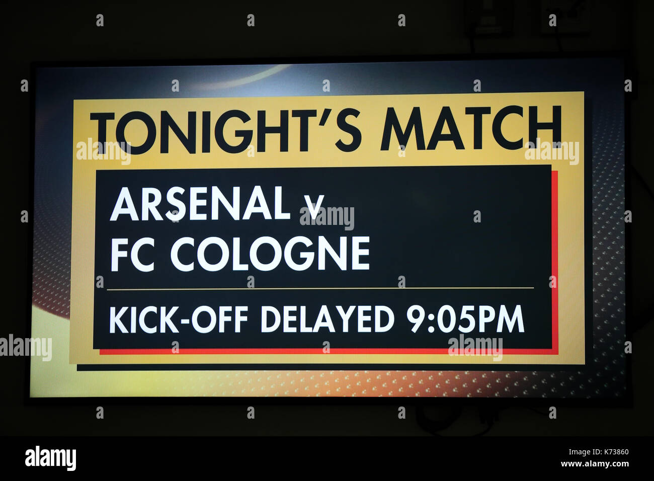 Lo Schermo Gigante Mostra Che Il Kick Off E Ritardato Per La Gara Di Europa League A Emirates Stadium Di Londra Foto Stock Alamy