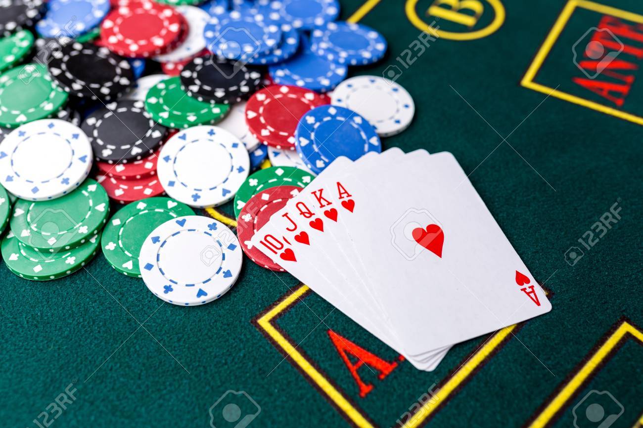 Immagini Stock Tavolo Verde Casino Con Una Mano Di Una Scala Reale In Un Gioco Di Poker Image