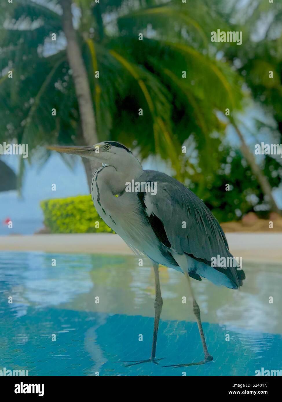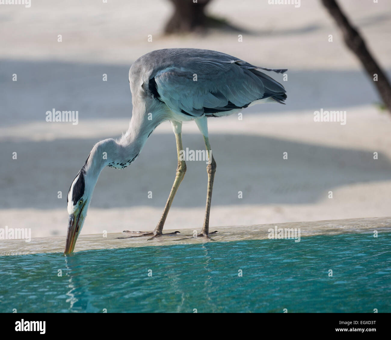 Heron Cendre Ardea Cinerea Boire A La Piscine Dans Un Hotel Resort Sur Une Ile Tropicale Dans Les Maldives Photo Stock Alamy