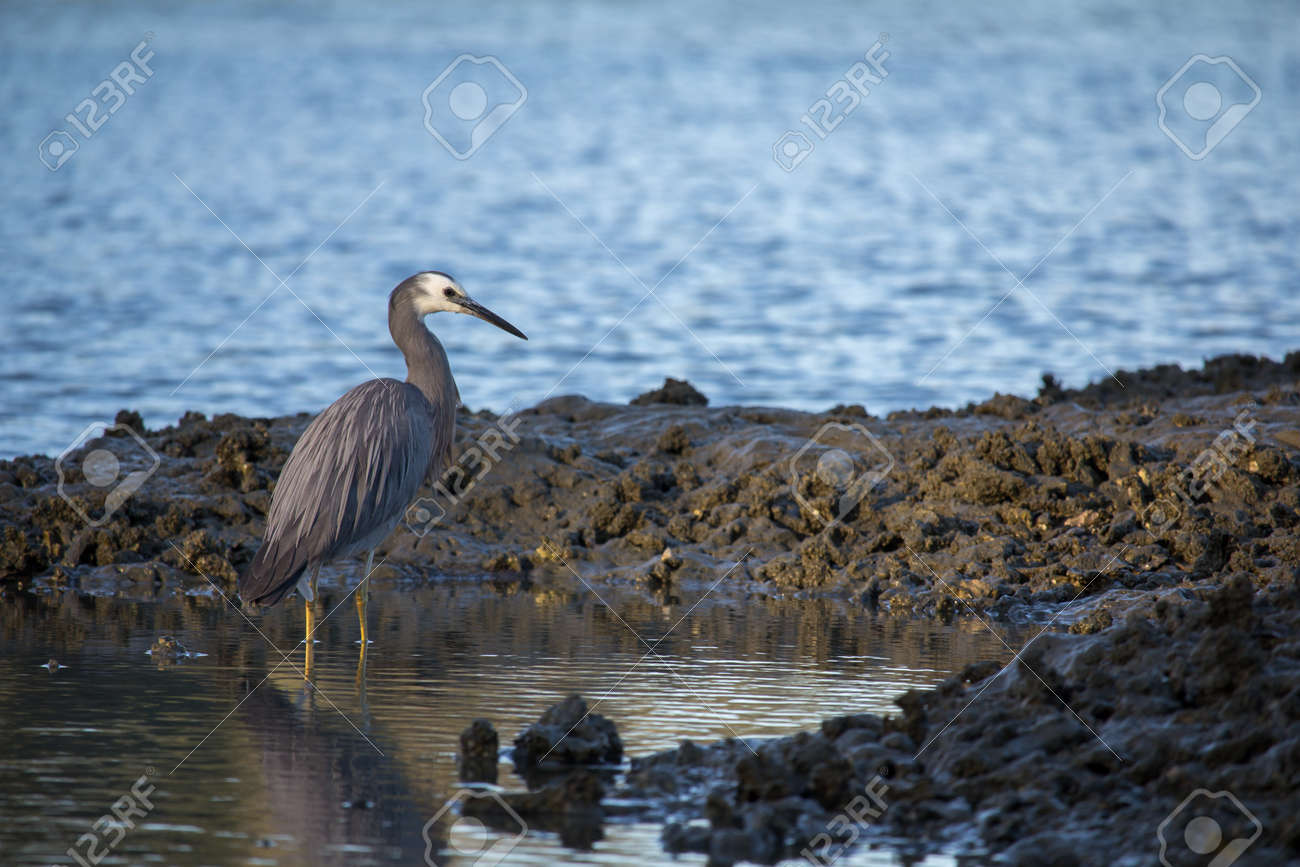 Heron A Face Blanche Patauger Dans Une Piscine De Roche A La Plage A Auckland En Nouvelle Zelande Banque D Images Et Photos Libres De Droits Image