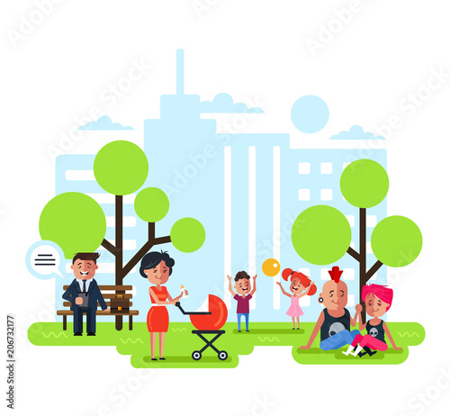 Happy Smiling People Characters Relaxing Walking Working Meeting Dating And Communication In Public Green Park Social Happy Life And Spending Time Vector Flat Cartoon Graphic Design Illustration Buy This Stock Vector