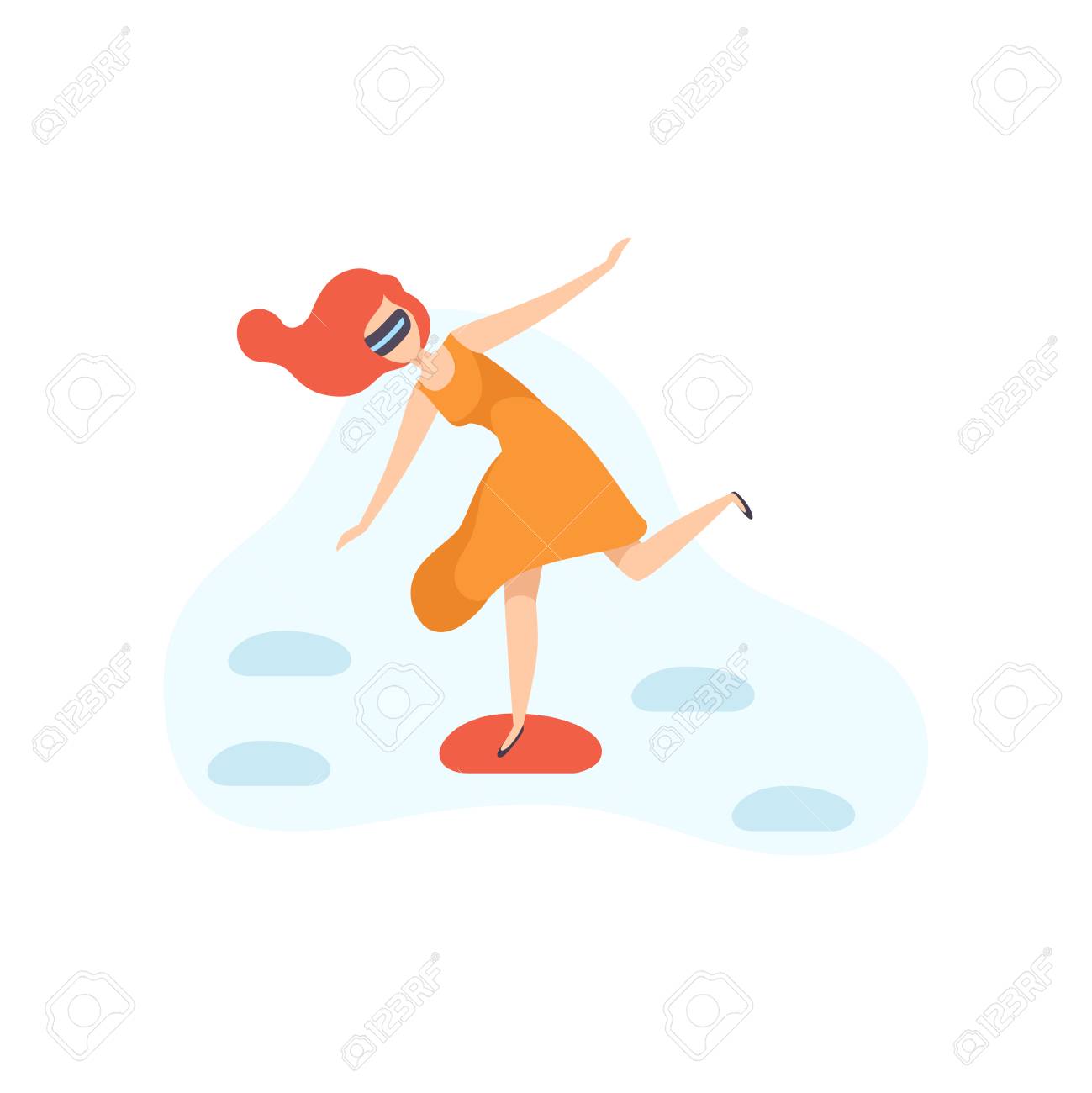 Young Woman Jumping On Stepping Stones Wearing Virtual Reality Royalty Free Cliparts Vectors And Stock Illustration Image
