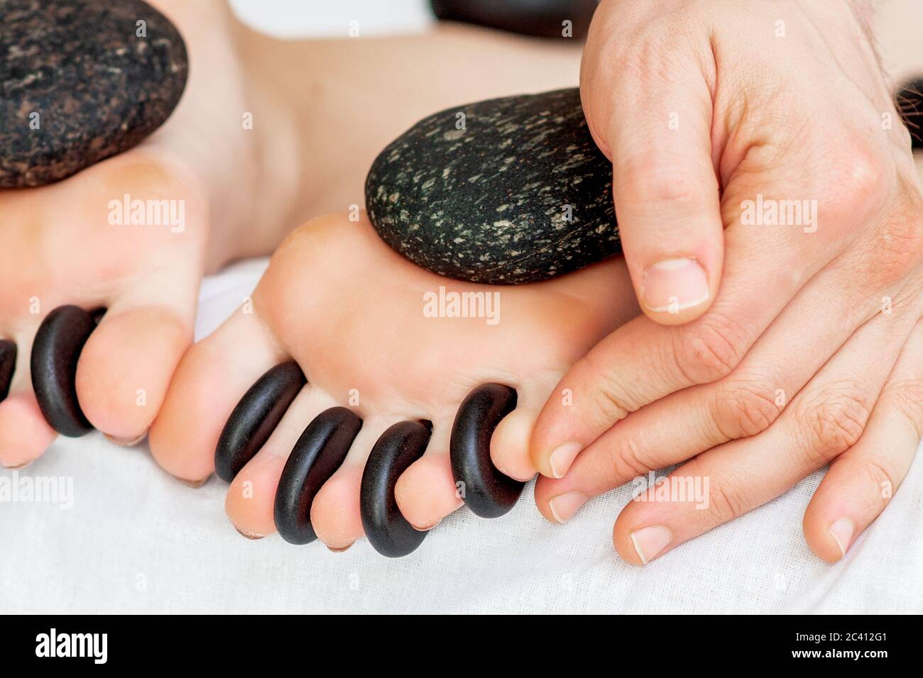 Hands Of Male Hands Putting Hot Little Black Stones Between Female Toes For Feet Massage Stock Photo Alamy