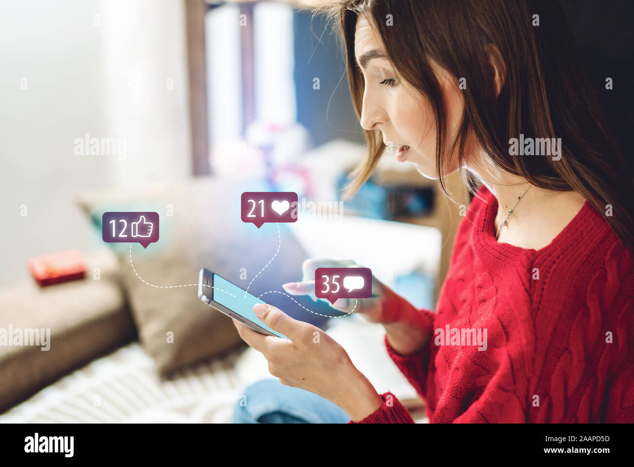 Young Beautiful Woman Using Her Phone Spends Time On Social Looking At The Display Girl Is Reading The Comments To The Post And Enjoying The Likes On Stock Photo Alamy