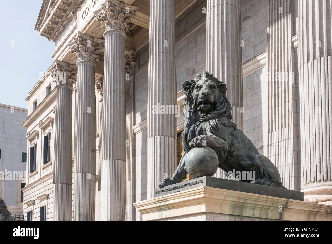 Una Scultura Lion Al Di Fuori Del Congreso De Los Diputados Il Parlamento Spagnolo Edificio Madrid Spagna Foto Stock Alamy