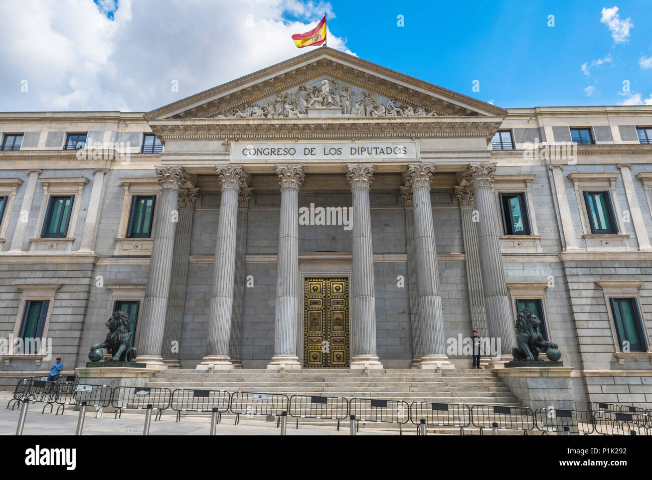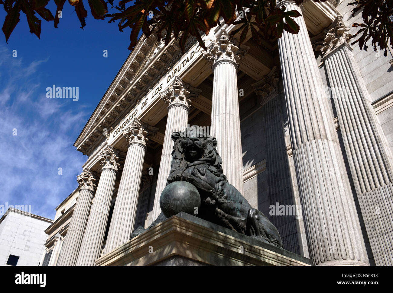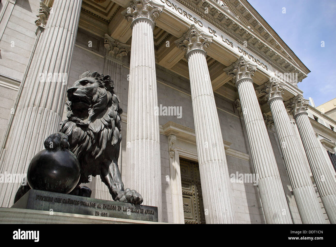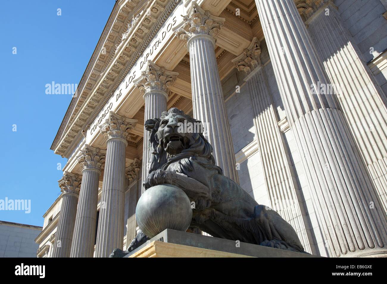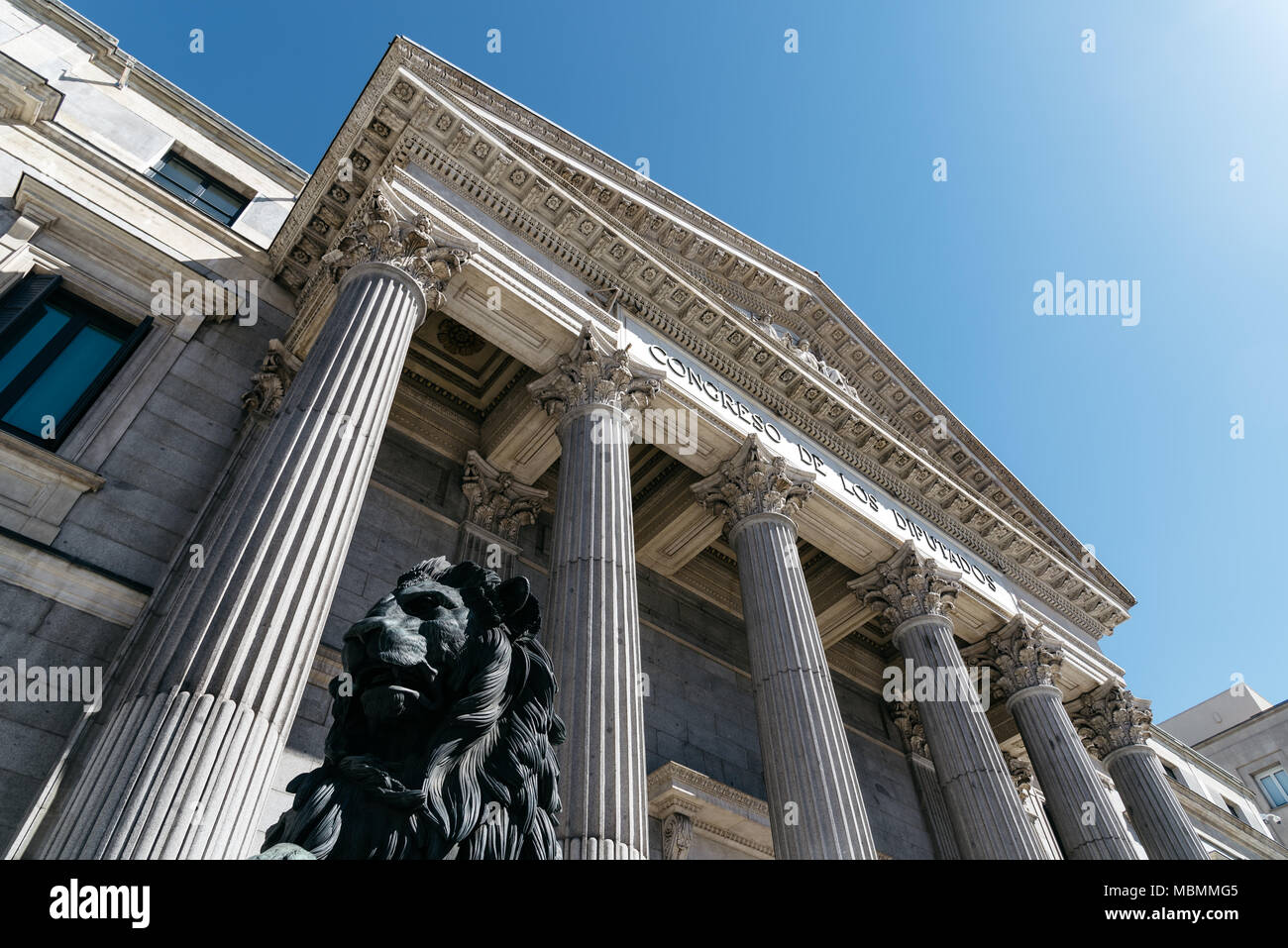 Basso Angolo Vista Di Ingresso Principale Al Parlamento Spagnolo Con Statue In Bronzo Di Leoni Foto Stock Alamy