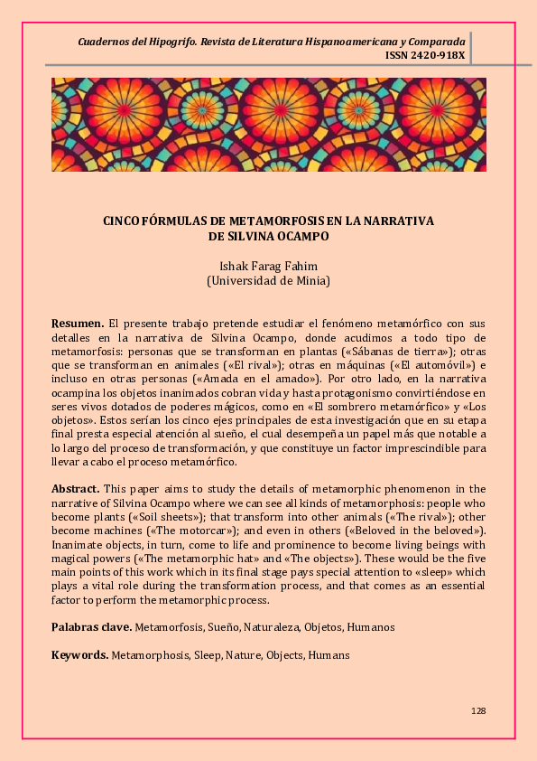 Pdf Ishak Farag Fahim Universidad De Minia Cinco Formulas De Metamorfosis En La Narrativa De Silvina Ocampo Ishak Farag Fahim And Cuadernos Del Hipogrifo Revista De Literatura Hispanoamericana Y Comparada Issn