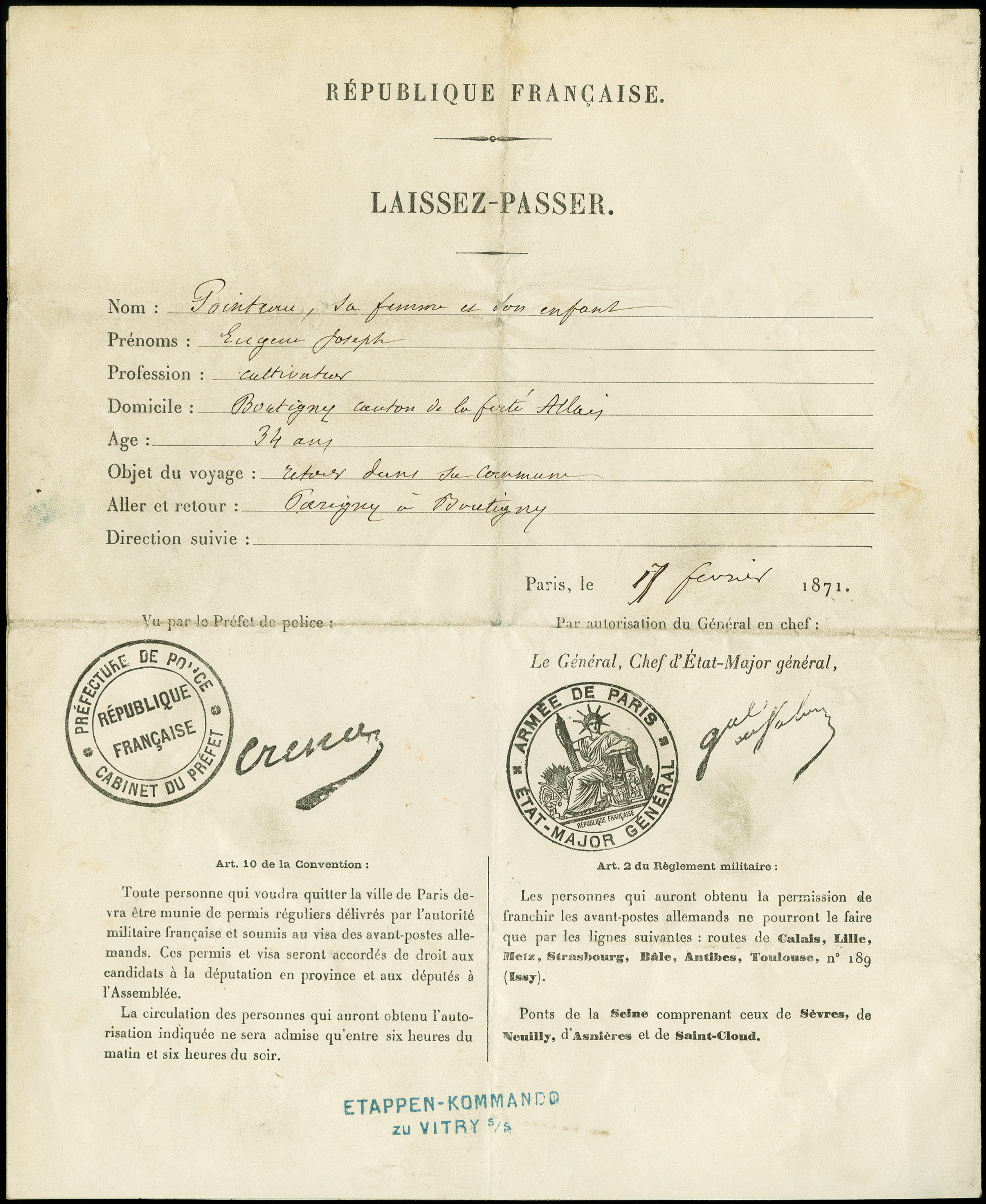 Laissez Passer D Henri Dabot Entre Le Belgique Et La France Concernant Des Affaires De Famille Paris 16 Fevrier 1871 Paris Musees