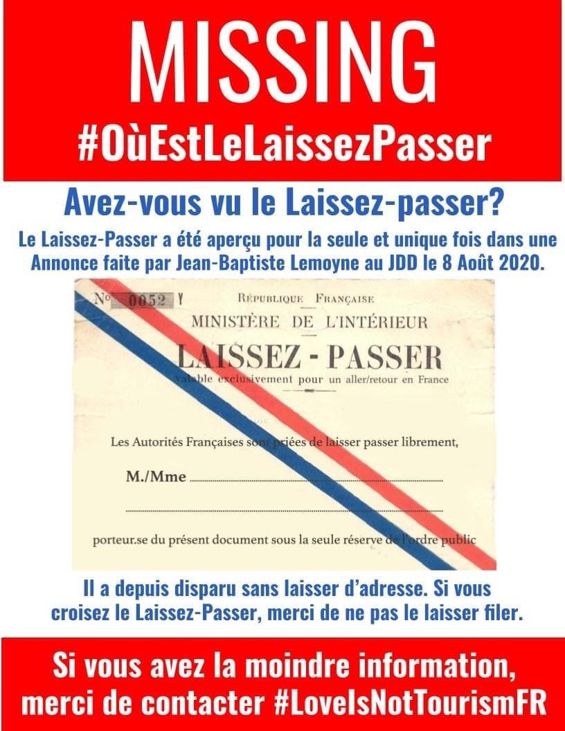 In addition to the normal travel restrictions (visa, duration of stay, etc), you should ask for a laissez passer from the Consulate of France for your place of residence For more information on the procedures for issuing this laissez passer, visit the website of the diplomatic or consular post of your place of residence. France France's top tourism official, From this week, an application for a laissezpasser can be submitted to the consulate the closest" A laissezpasser is an exemption to the travel ban. LaissezPasser (LP) is a rightsbased organization tackling the inequalities in human mobility Founded in 18 in Estonia, Laissez Passer has a mandate to navigate crossnational and crossborder mobility and access barriers LP is registered in Estonia to leverage the advancements made by the country in the field of egovernance and digital.