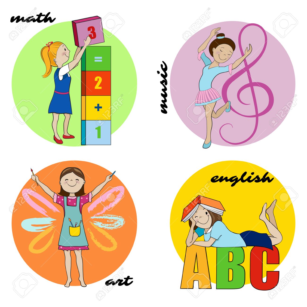 Vettoriale Insieme Di Soggetti Di Scuola Di Fumetto Illustrazioni Design Rotondo Le Icone Per L Inglese O La Lettura La Matematica E L Arte La Musica O La Danza Image