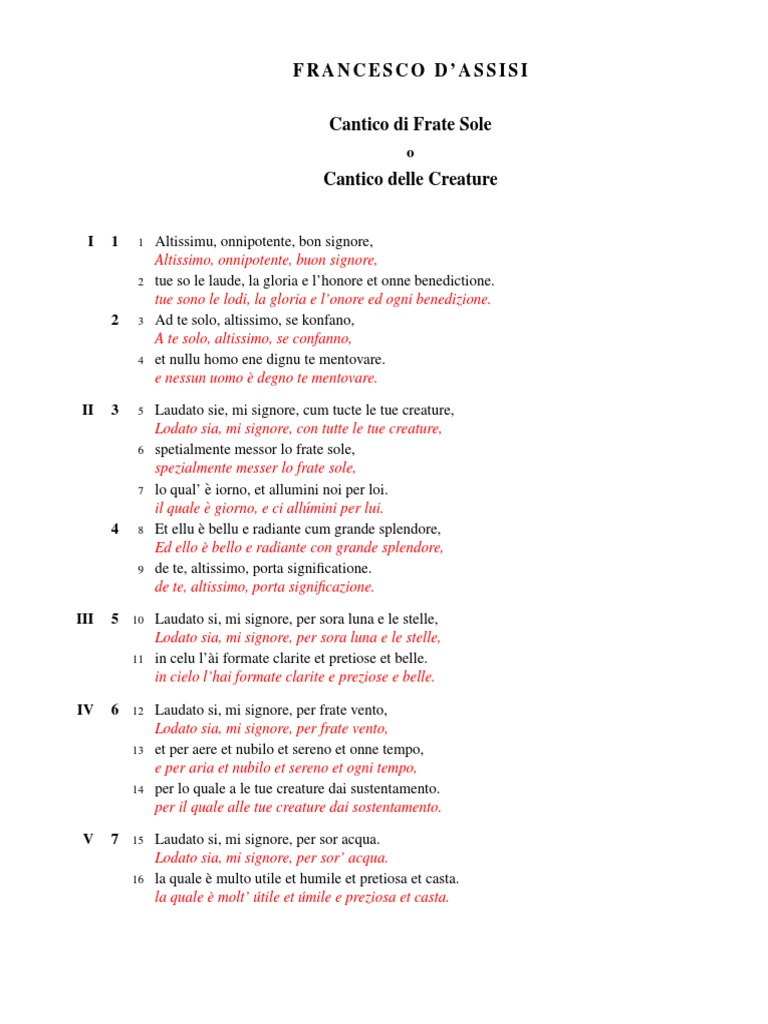 Il Cantico delle Creature (Canticum o Laudes Creaturarum), anche noto come Cantico di Frate Sole, è il testo poetico più antico della letteratura italiana che si conoscaNe è autore Francesco d'Assisi e, secondo una tradizione, la sua stesura risalirebbe a due anni prima della sua morte, avvenuta nel 1226 È comunque più probabile che, come riportano le biografie di Francesco, la. Il Cantico delle Creature in Inglese Traduzione in inglese Hymn to Brother Sun Canticle of the Creatures The prayer by St Francis of Assisi Highest, omnipotent good Lord!. Il Cantico delle creature o Cantico di frate sole è stato scritto in lingua volgare umbra da San Francesco d'Assisi poco prima della sua morte avvenuta nel 1226 Se ne danno qui una breve.
