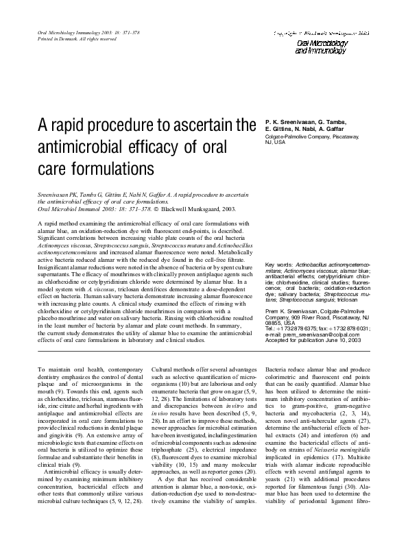 Pdf A Rapid Procedure To Ascertain The Antimicrobial Efficacy Of Oral Care Formulations Prem Sreenivasan Academia Edu