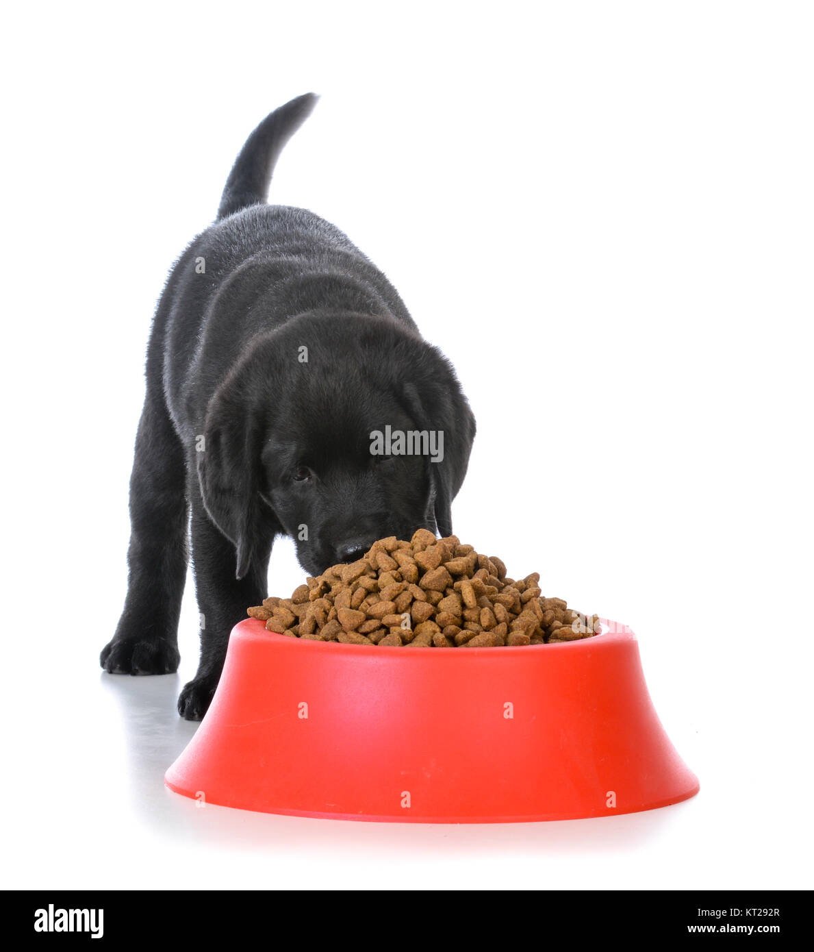 Nero Labrador Retriever Puppy Kibble Mangiare Al Di Fuori Di Un Cane Rosso Piatto Di Cibo Su Sfondo Bianco Foto Stock Alamy