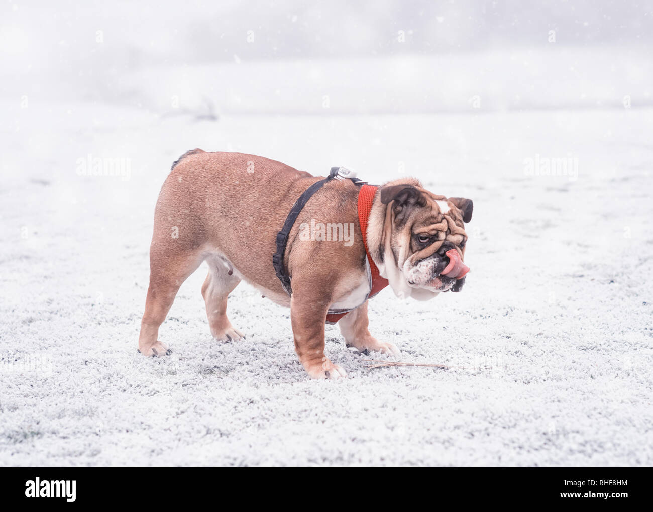 Divertente Cane Rosso E Nero Bulldog Inglese Giocando Sulla Neve E Attaccare Fuori La Sua Linguetta Foto Stock Alamy