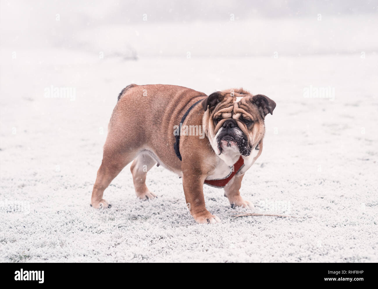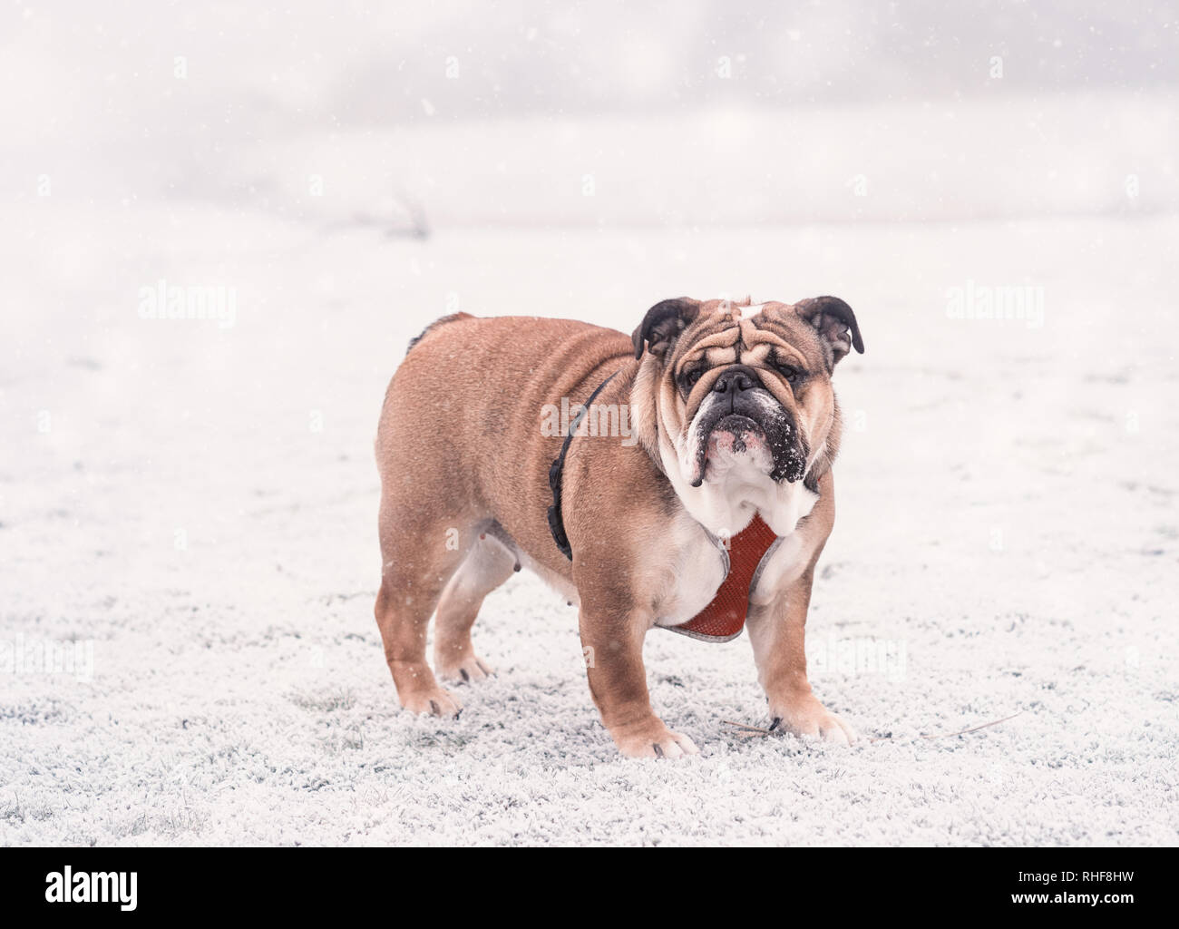 Divertente Cane Rosso E Nero Bulldog Inglese Giocando Sulla Neve Guardando La Fotocamera Foto Stock Alamy