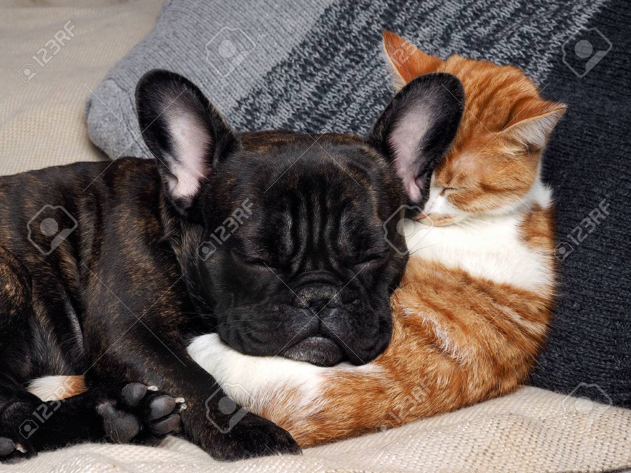 Immagini Stock Gatto E Cane Svegli Che Dormono Insieme Il Gatto E Bianco Con Un Cane Rosso Nero Un Bulldog Francese Image
