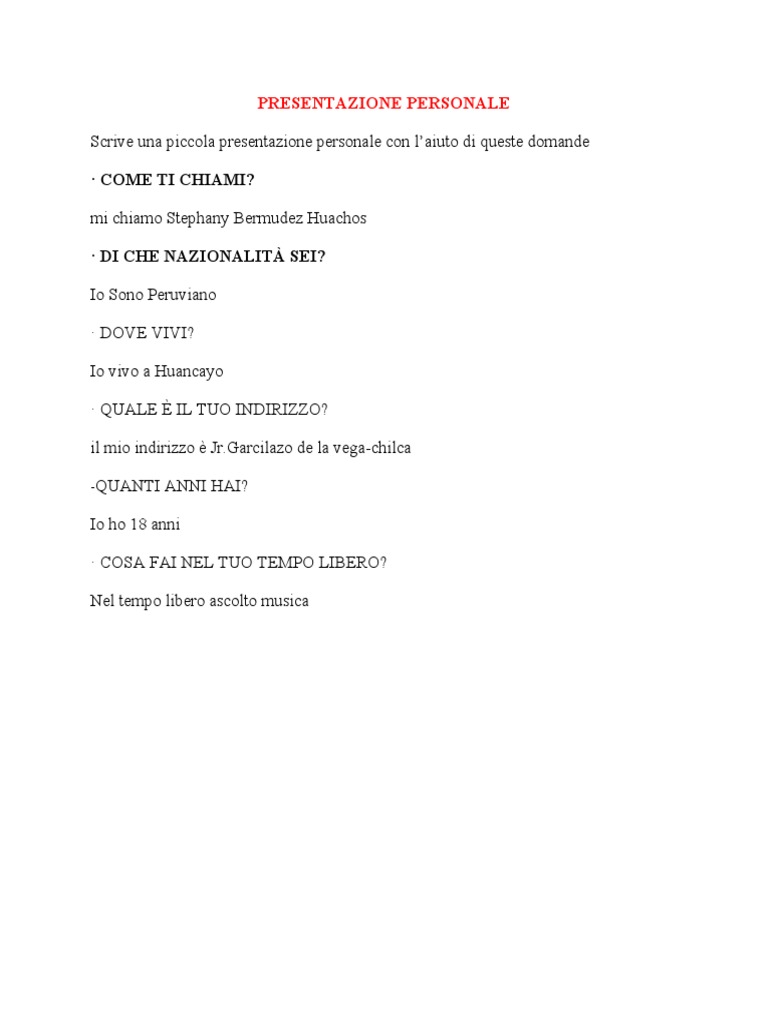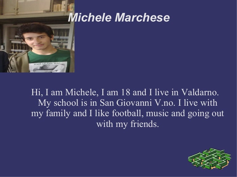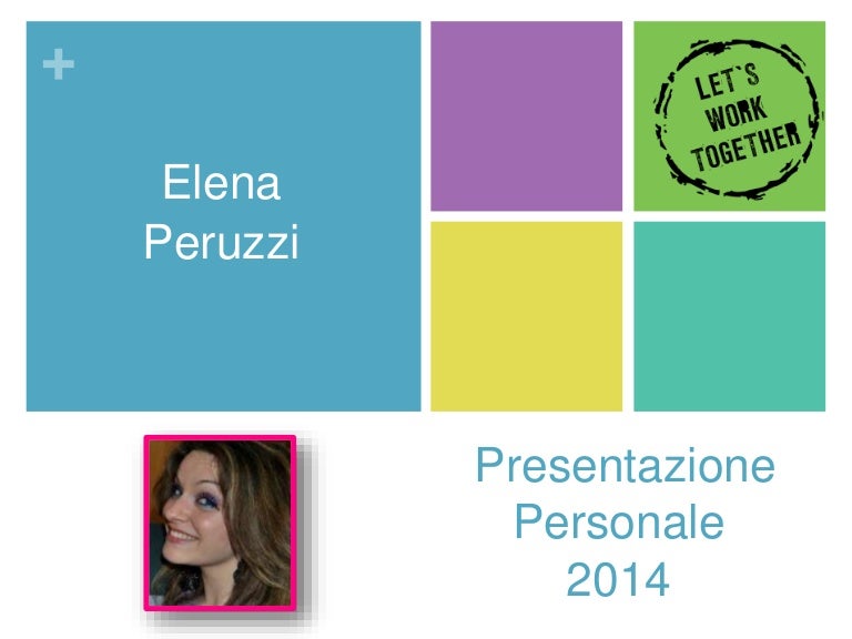 Crea una nuova presentazione e apporta modifiche contemporaneamente ad altre persone Lavora con o senza connessione Internet Utilizza Presentazioni per modificare i file di PowerPoint Gratis. Non devi confonderlo con la lettera di presentazione di un curriculum, visto che il profilo (o la descrizione personale) fa parte del tuo curriculum, mentre la lettera è un documento allegato Tra tutti gli elementi del tuo profilo personale , devi scegliere quelli più importanti o meglio, quelli principali per poter scrivere la tua. Presentazione Personale Ciao, io mi chiamo Enrique, ho diciassette anni, ho due fratelli che si chiamano Eduardo ed Emiliano, ed hanno tredici e sette anni Non ho sorelle Mio papà si chiama Enrique ed a quarantacique anni, mia mamà si chiama Anabel ed ha quarantacinque anni Ho sei zii e quattrodici cugini.