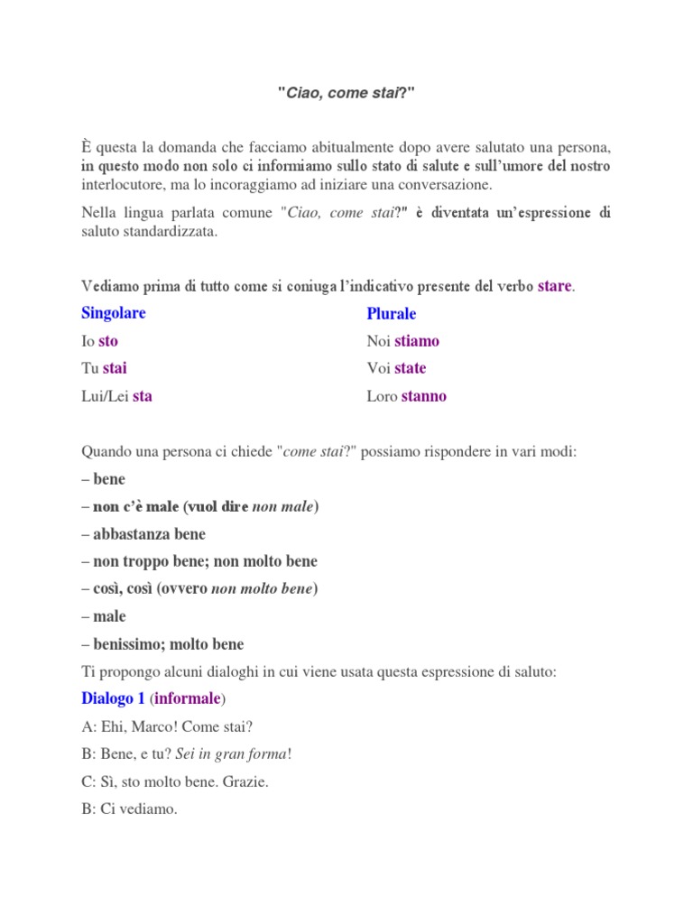 Come stai in inglese informale. Saluti formali Questi sono i saluti da utilizzare nei seguenti casi Saluti a metà tra il formale e l’informale Questi sono i saluti da utilizzare nei seguenti casi Come sta/stai/state?. Modi per / dic 14 stai / tutti dirloCOME I past tense in inglese che cosa sono?. Traduzione per 'Come stai?' nel dizionario italianoinglese gratuito e tante altre traduzioni in inglese babla arrow_drop_down babla Online dictionaries, vocabulary, conjugation, grammar Toggle navigation.