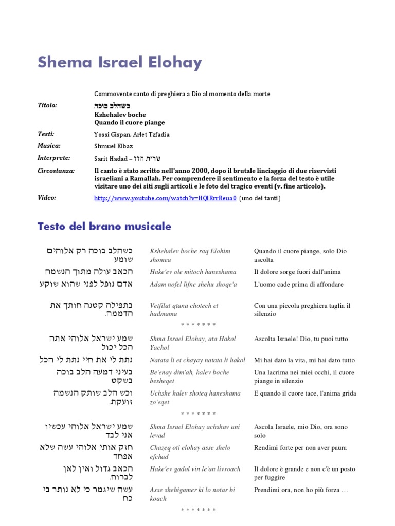 31gen16 Esplora la bacheca "CANTI" di Chiara Faberi su Visualizza altre idee su youtube, canzoni, stella polare. Shemà Israel Ascolta Israele per una reintroduzione di alcuni termini ebraici nelle traduzioni moderne della Bibbia Shemà Israel Se c’è un canto che crea emozione ascoltare è quello dello Shemà Tratto dalle parole della Torah del libro di Deuteronomio lo Shemà è Un canto, un simbolo, un credo, in ultima analisi Parola. Shema Yisrael (Shema Israel or Sh'ma Yisrael;.