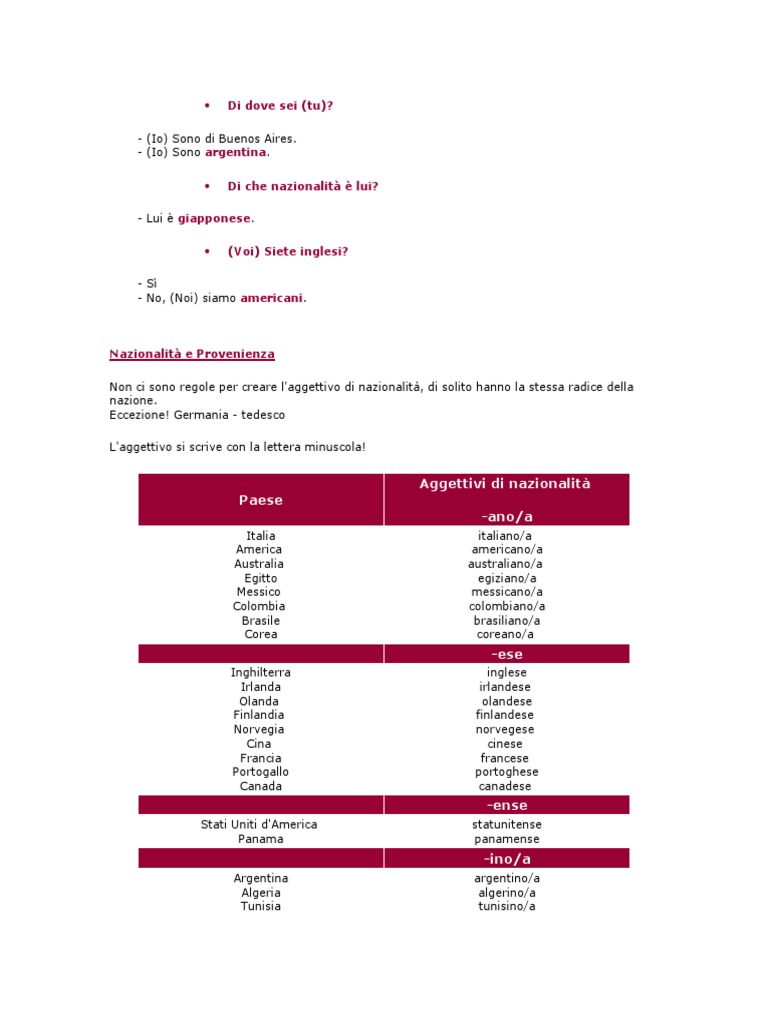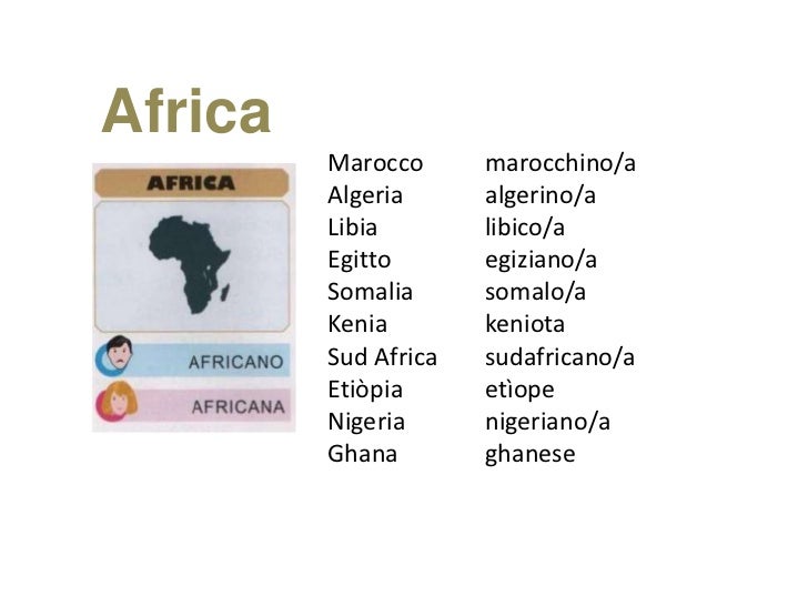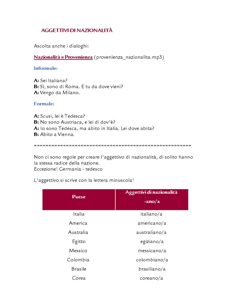 Aggettivi di nazionalità ano/a Italia America Australia Egitto Messico Colombia Brasile Corea italiano/a americano/a australiano/a egiziano/a messicano/a colombiano/a inglese irlandese olandese finlandese norvegese cinese. Paese Aggettivi di nazionalit ano/a Italia America Australia Egitto Messico Colombia Brasile Corea italiano/a americano/a australiano/a egiziano/a messicano/a colombiano/a brasiliano/a coreano/a Paese Aggettivi di nazionalit ese Inghilterra Irlanda Olanda Finlandia Norvegia Cina Francia Portogallo Canada inglese irlandese olandese finlandese. In inglese, gli aggettivi e i sostantivi di nazionalità sono utilizzati comunemente per indicare la provenienza o fare riferimento agli abitanti di una nazione o uno stato Nel corso della lezione, vedremo le regole generali di formazione dell'aggettivo di nazionalità e presenteremo alcune delle eccezioni e irregolarità più comuni.