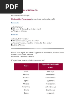 Aggettivi e sostantivi di nazionalità Inglese/Aggettivi e sostantivi di nazionalit. Aggettivi di nazionalità a il greco Inghilterra inglese Tínglese Irlanda irlandese Tínglese Italia italiano,a l'italiano Lettonia lettone il lettone Lituania lituano,a il lituano Lussemburgo lussemburghese il francese, il lussemburghese, ¡I tedesco Malta m áltese Tínglese, il maltese Messico messicano, a lo spagnolo Norvegia. Traduzioni in contesto per "nazionalità" in italianoinglese da Reverso Context in base alla nazionalità, sulla base della nazionalità, basata sulla nazionalità, senza nazionalità.