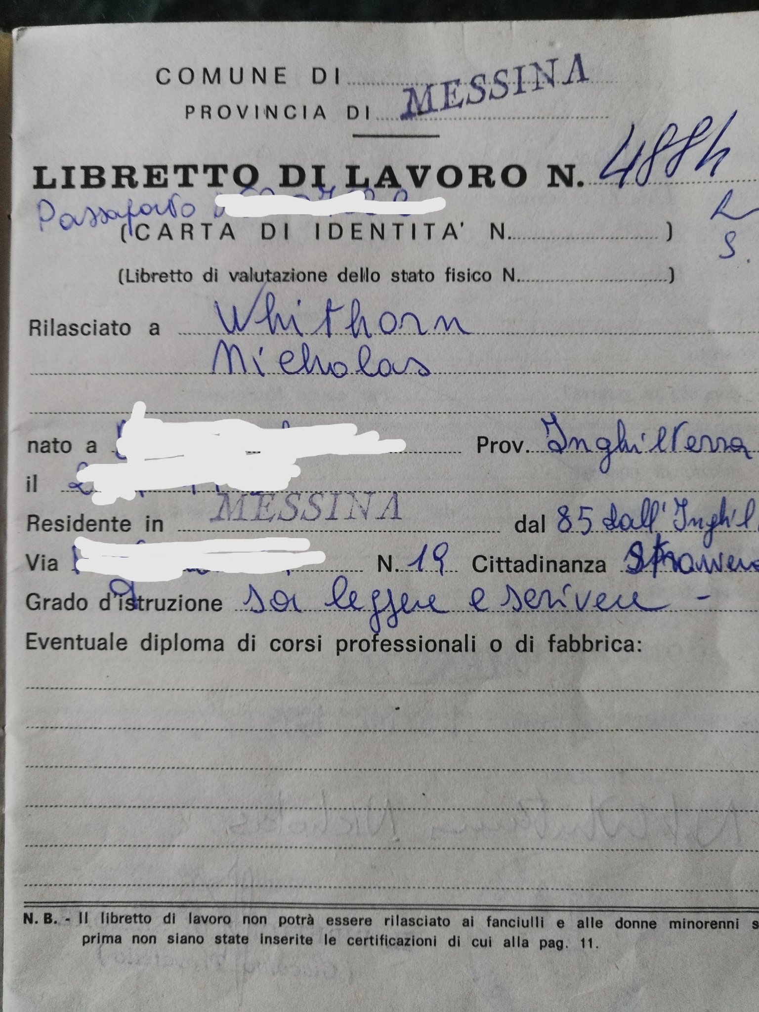 Nicholas Whithorn Clearing Out Old Papers Came Across My Libretto Del Lavoro Issued When I Arrived In Italy In 1985 When Indicating My Level Of Education They Wouldn T Accept